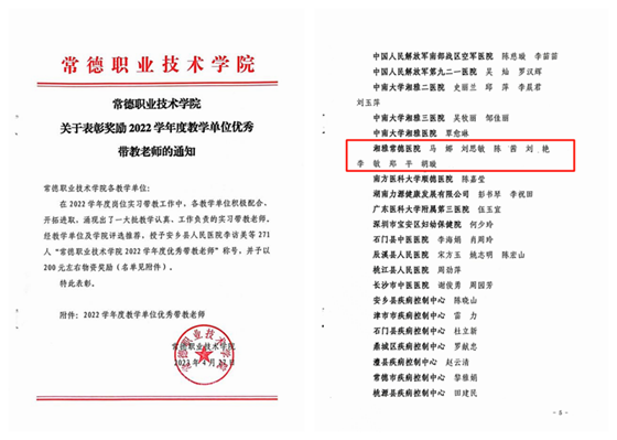 近日,根据常德职业技术学院教学单位优秀带教老师评选要求,湘雅常德医院郑平等7名医护人员获得常德职业技术学院2022年度“优秀带教老师”称号。