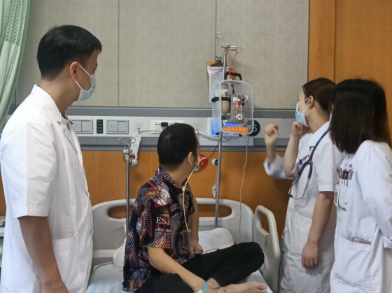 住入湘雅常德医院内分泌科第二天,护士胡译文对欧先生进行了徒手磁导航下留置鼻空肠管术,沈菊教授指示开始肠内营养治疗,根据患者耐受情况逐步调整营养液输注速度,欧先生恶心、呕吐、腹痛症状逐渐好转,脸上终于露出了久违的笑容。