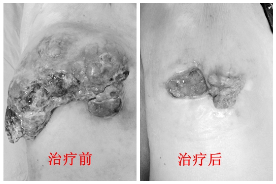 住院期间完善相关检查,高奶奶确诊为右乳恶性肿瘤且侵犯胸壁,同时肺部转移可能性大,无手术指征,经乳腺癌MDT团队多学科会诊,转入肿瘤科。中南大学湘雅医院委派专家、肿瘤科主任钟美佐教授及其团队陈俊副主任医师对高奶奶进行了全面、综合的评估,根据乳腺肿物穿刺病理及分子分型的结果,结合高奶奶病情,决定进行一线内分泌治疗。患者初诊时右乳有一个大小约20cm*15cm菜花状糜烂创面,每天大量脓性分泌物流出伴恶臭,严重影响患者生活质量,为了最大程度上维护患者的尊严,肿瘤科请专科护理中心罗方英副主任护师进行会诊,为高奶奶巨大右乳创面进行专科换药护理。罗方英副主任护师针对患者具体情况,制定个性化的以控制感染、创面修复为主要目标的治疗方案。