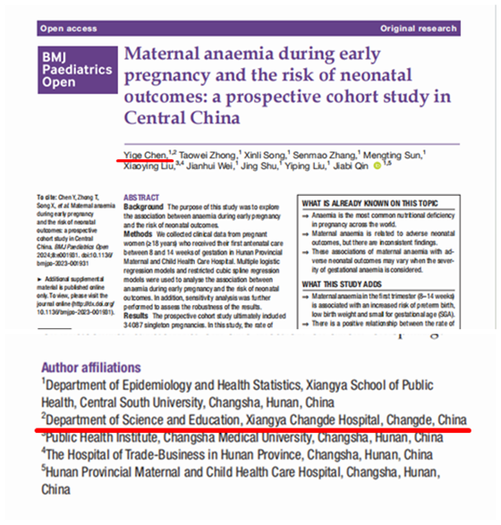 近日,湘雅常德医院医务部团队一篇研究论文在国际知名期刊《BMJ Paediatrics Open》(JCR 2区,IF:2.6)上发表,论文题目为《Maternal anaemia during early pregnancy and the risk of neonatal outcomes: a prospective cohort study in Central China》,湘雅常德医院医务部陈羿戈医师为第一作者,湘雅常德医院科教办为共同署名单位。