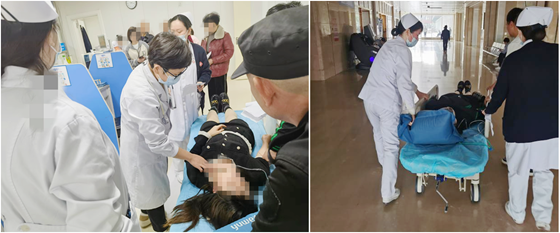 10点20分,沈菊医师立即评估刘女士病情,经过紧急处理,患者神志清楚,生命体征平稳,无外伤,沈菊主任医师指示转运患者到急诊科进一步救治,医务人员一起通过急救电梯护送患者至急诊科。在护送患者刘女士途中,医护人员密切观察患者病情变化,不断安慰患者和家属,患者及家属均表示感谢。