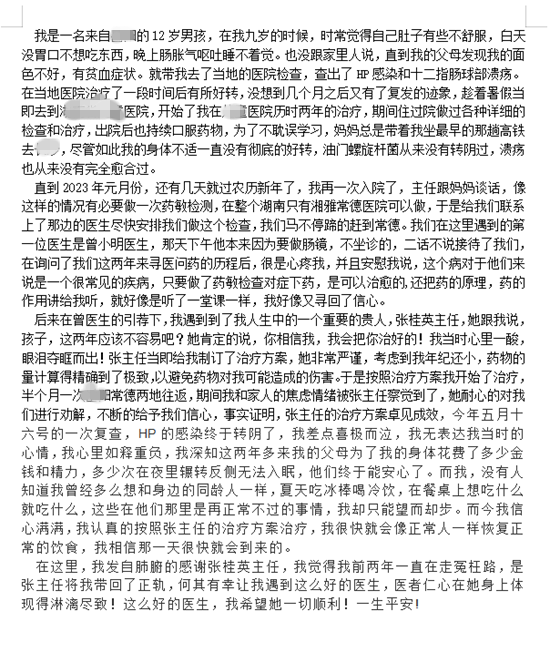 12岁的小龙是龙先生的孙子,从9岁开始,时常出现腹部不适、食欲下降、腹痛、腹胀、呕吐甚至夜间无法入睡,父母带他至医院检查才发现竟然是幽门螺杆菌感染和十二指肠球部溃疡惹的祸。通过治疗后,小龙的症状有所好转,但几个月后又反复。为了给小龙治病,一家人带着小龙2年多辗转省内多家三甲医院检查治疗,但效果欠佳,多次行幽门螺杆菌根除治疗均未成功,溃疡一直未愈合。直到2023年元月,一家人慕名来到湘雅常德医院消化内科就诊。张桂英教授在仔细了解病情后,一方面安慰小龙及其父母,不要担心,要树立信心,一方面为小龙安排了胃镜检查及幽门螺杆菌培养及药敏试验及耐药基因检测。胃镜检查发现小龙十二指肠球部有一巨大溃疡,根据检查检验结果,为小龙制定了精准个体化治疗方案。治疗后复查,小龙的幽门螺杆菌根除成功,十二指肠巨大溃疡已愈合。小龙在感谢信中写道“没有人知道我曾多么想像同龄人一样,想吃什么吃什么,如今愿望成真,何其有幸让我遇到了这么好的医生,医者仁心在她身上体现得淋漓尽致!”。