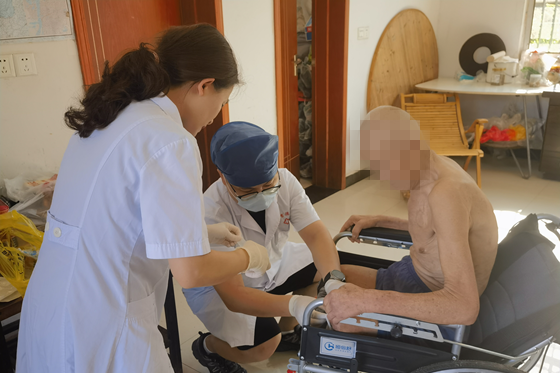 魏大爷年龄大、心肺功能差,基础疾病多,截肢后悲观、抑郁、不愿与人沟通。骨科医护团队了解后,十分关心老人在家情况,多次进行电话随访慰问。近日,骨科医护团队得知老人伤口愈合欠佳,考虑到魏大爷家住偏远,平时家中只有老伴在身边照顾,两人行动都不便,无法去医院复查。为帮助患者解决实际困难,提升“失能”老人生活信心,骨科负责人陈芳田主任医师、周天宝主任医师、张娟护士长及团队特地来到了魏大爷家进行慰问。
