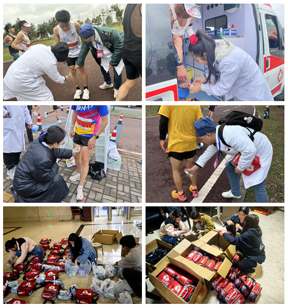 比赛现场,医院在赛道的救护车点、沿线医疗点、移动医疗点等各个关键位置均设立了医疗保障设施。医务人员团队携带齐全的急救设备时刻保持高度警惕,密切关注着每一位跑者的身体状况,保证在选手出现身体不适或意外受伤时,能够迅速做出反应,第一时间进行救治。除了医疗保障,医院还安排了6名工作人员参与了重要的后勤保障工作,从15日起,便着手为医疗保障人员整理物资、筹备现场培训会务等工作,确保医疗保障团队在比赛过程中能够保持良好的体力和状态。同时,还负责赛前与赛后的物资收发,使整个赛事的后勤保障工作高效有序。