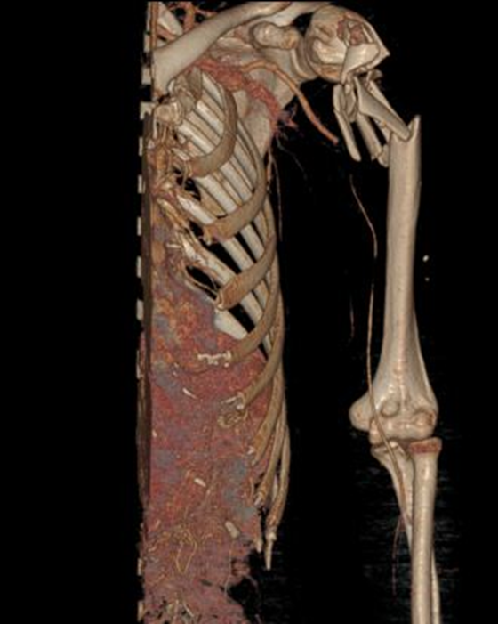 一名60岁女性患者因外伤导致左上臂疼痛出血,被诊断为“左肱骨开放性骨折”紧急送至湘雅常德医院骨科。接诊医生发现患者左侧上肢血运障碍,可能存在高位肱动脉或腋动脉损伤风险。为挽救肢体,骨科创伤组迅速评估患者情况:其肱骨外科颈粉碎性骨折,肱骨头翻转游离,血管CTA提示腋动脉与肱动脉移行区损伤可能。杨雷主治医师制定了急诊清创+血管探查修补+外固定架固定术的初步方案,并计划二期进行肱骨近端骨折切开复位、取腓骨植骨及内固定术。