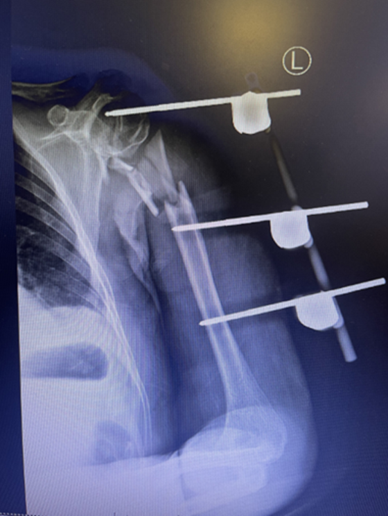 在初步治疗后,骨科团队持续监测患者恢复情况。经过一段时间的康复训练,团队评估认为可以进行二期手术以进一步稳定骨折并恢复功能。后取得患者及其家属的同意后,杨雷主治医师联合湘雅医院本部专家共同制定方案,手术成功完成后,患者左上肢血运、感觉及运动功能均恢复正常。术后复查显示骨折区骨痂生长良好,患者可无痛主动活动左肩关节至外展80°,基本生活已完全自理。患者对治疗效果表示高度认可,并感谢医护团队的付出。