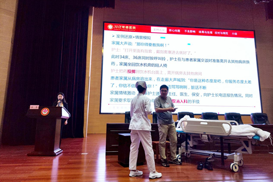培训前,护理部副主任金惠编排一例因护士违反执行医嘱制度、服务态度差而导致与患者家属发生冲突事件的剧本,对角色体验人员、道具准备、情景模拟过程等作了详细、周密的安排。课程中,以现场情景模拟的形式直观地展现护理操作不当、沟通不畅、人文关怀欠缺等核心问题,让参会者身临其境感受冲突事件造成的严重不良后果。角色体验者沉浸式感受冲突事件的发生、发展过程,从患者和家属角度讲述内心真实感受。金惠副主任引导参会护士发言交流,对患者和家属心理进行剖析,深度挖掘问题根源,找出潜在隐患及不良后果并提出了切实可行的防范举措与应对策略。