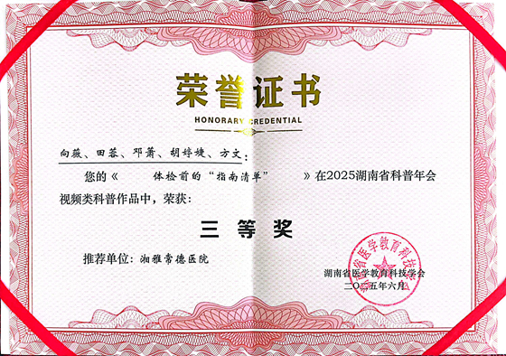 近日,湖南省医学教育科技学会科普创作与传播专业委员会 2025 年学术年会在湖南益阳顺利举办。大会以“新赛道、新格局、新发展”为主题,围绕学科科普的组织能力建设、创作传播方法及多样化实现路径开展深入交流,并举行了健康科普大赛评选,汇集了全省数十家医院机构的优秀作品。湘雅常德医院健康管理中心凭借创新科普视频《体检前的“指南清单”》荣膺“三等奖”。