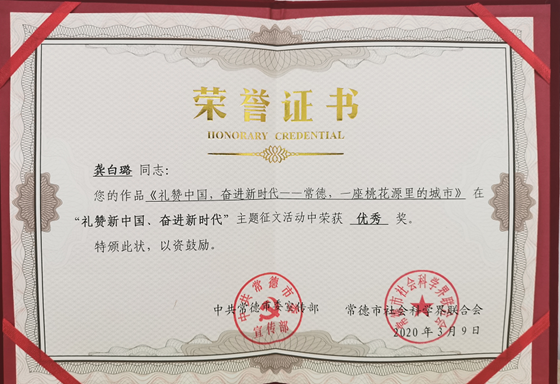 为隆重庆祝中华人民共和国成立70周年,中共常德市委宣传部、常德市社会科学界联合会于2019年8月联合开展了“礼赞新中国、奋进新时代”主题征文活动,面向全市征集优秀作品,礼献国庆华诞,来自湘雅常德医院泌尿外科龚白璐投稿的《礼赞中国、奋进新时代——常德,一座桃花源里的城市》稿件经过专家初评、复评、终评等环节,从参赛作品中脱颖而出,获得了优秀奖的好成绩。据悉,本次活动全市共收到投稿202篇,其中,共评选出获奖作品28篇。
