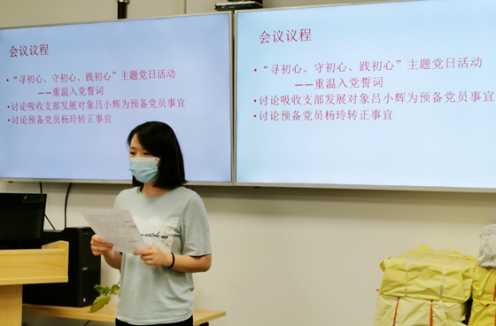 大会首先由支部书记胡命同志宣布大会开始并汇报会议到会情况,向支部党员说明开会的目的和意义。会议的第一项议程即围绕“寻初心、守初心、践初心”的主题重温入党誓词,在支部书记胡命同志的带领下,与会的党员全体起立,面对鲜红党旗,庄严举起右拳,以铿锵有力的声音向党旗再次宣誓,表达了“寻初心、守初心、践初心”的信念和决心。