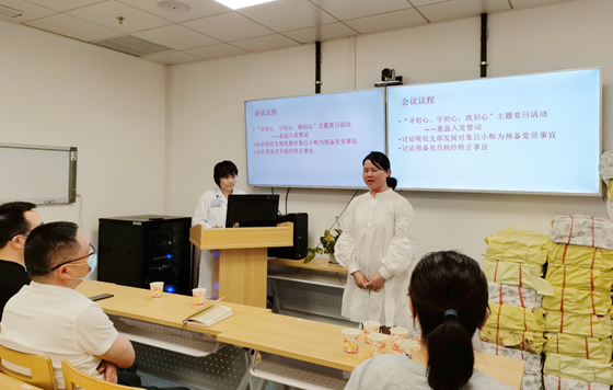 6月24日下午13:00,湘雅常德医院第五党支部在门诊示教室召开第二季度支部党员大会暨第6月支部主题党日活动,会议主题为重温入党誓词并讨论吸收支部发展对象吕小辉同志为预备党员、支部预备党员杨玲同志转正的相关事宜,本次会议由支部书记胡命同志主持,党委委员黄永清同志出席会议并进行指导,支部共20名正式党员参与了本次大会。