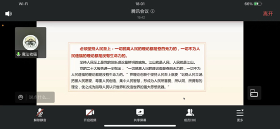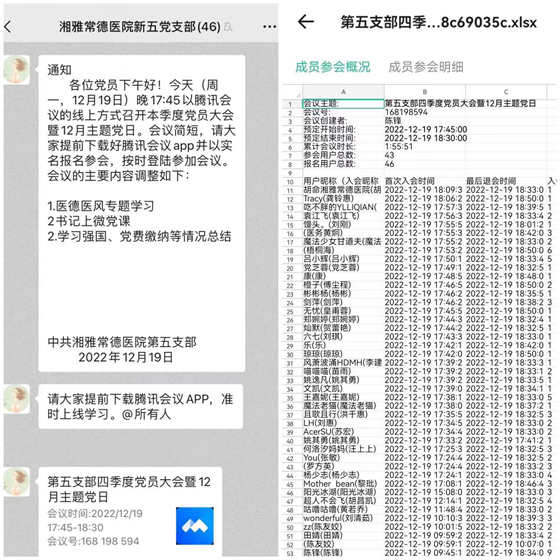 “大家能不能听清,收到请回复一下,请各位同志切换到静音模式,会议即将开始……”。2022年12月19日晚,湘雅常德医院第五党支部通过远程实时沟通,以线上“腾讯会议”的形式顺利召开第四季度党员大会暨12月份主题党日活动,会议由支部组织委员陈锋主持,根据疫情防控“新十条”和省市优化措施,为减少疫情期间人员集会的风险,全体非值班党员共同线上参会。