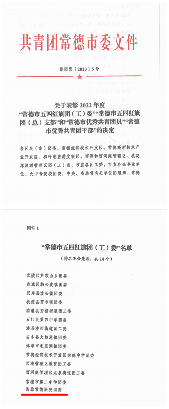 近日,共青团常德市委下发《关于表彰2022年度“常德市五四红旗团(工)委”、“常德市五四红旗团(总)支部”和“常德市优秀共青团员”“常德市优秀共青团干部”的决定》,对2022年表现突出的先进典型进行表彰。湘雅常德医院团委被授予2022年度“常德市五四红旗团委”荣誉称号。该项荣誉的获得,是上级团委对我院共青团工作的肯定,也是对我院团委思想政治教育工作和团的建设工作成果的高度肯定。