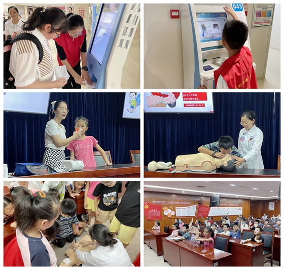 在学习环节中,首先由药剂科的熊亚群老师用动画短片和通俗易懂的语言向小志愿者们普及了基础用药知识和用药禁忌。随后,科教办的老师通过现场演示,为大家进行了气道异物梗阻、溺水急救手法的教学。