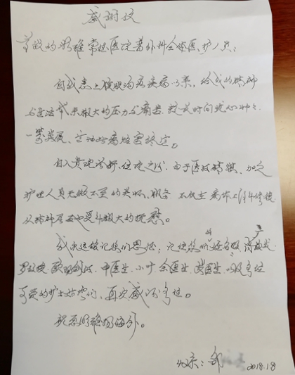 邹大爷一封家书式的感谢信,确实流露出许多对我们的感激之情和赞誉,同时我们也倍感身上的责任重大,它将鼓励和鞭策着普外科全体成员更加团结、奋进,以真心、爱心、责任心及更精湛的医疗护理技术为泛湘西北的老百姓解除病痛,做他们身心健康的“保护神”。