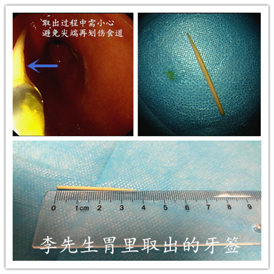 亲朋好友相聚,免不了推杯换盏,然而餐桌上小小牙签,却一不小心成了“祸首”。 来自常德的李先生今年28岁,两周前跟亲友聚餐饮酒时,不小心将一根牙签吞入腹中,当时并无明显不适,因而未在意。没想到在接下来3天,李先生总感觉上腹部反复疼痛,遂到当地医院就诊,腹部CT及腹部X线检查并未发现异物,但上腹部疼痛感觉似乎越发明显了。邃来到湘雅常德医院就诊,湘雅常德医院接诊患者后,立即安排患者行急诊胃镜检查。 胃镜下发现,李先生食管有一2cm*0.5cm纵行溃疡,经仔细寻找,在胃小弯处发现一根牙签样异物刺入胃壁,仅露出约0.2cm在胃内,并随着胃的舒缩上下伸缩。湘雅常德医院消化内科主任张桂英教授当即决定为患者实施内镜下胃壁穿透性异物取出术。消化内科内镜医护团队默契配合,在胃收缩、当牙签外露明显时夹住牙签,沿胃体纵轴方向,小心往外拔,避免取出过程中牙签两端再次划伤消化道。迅速将一长约4cm的牙签取出,术后未见出血及其他不适。为预防胃液从牙签刺穿的胃壁孔漏出,导致急性腹膜炎等并发症,李先生被安排住院治疗观察。经过2日的治疗观察,李先生痊愈出院,未见并发症。出院后一周回访,患者已恢复正常生活工作,无并发症。 据了解,牙签是常见的消化道异物之一,尤其是饮酒后更容易发生,主要由于牙签为餐桌上常用物品,饮酒后人们反应力下降,甚至意识不清,更有些人认为酒杯里放一根牙签可以使啤酒的泡沫更快消除,因而导致酒后误吞牙签发生率更高。 据张桂英教授介绍,牙签、鱼刺等尖锐异物相较于一些圆润的异物危险性更大,误吞后,轻者可能划伤消化道,导致消化道溃疡,重者可能刺穿消化道引起消化道穿孔、急性腹膜炎、严重感染、消化道瘘、甚至刺破大血管导致大出血危及生命。如果发现误吞异物,应当停止进食,并立即就医,不要因为当时并无不适而忽略。异物如果卡在食道,不要采用大口喝水、喝醋、吞饭、吞韭菜等方式强行将异物咽下,这些“土办法”可能不仅无用,还加重损伤,使异物刺入食管更深,甚至损伤周围脏器及血管,也加重医生取异物难度及风险。