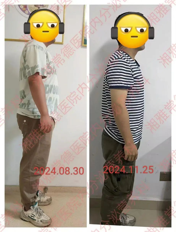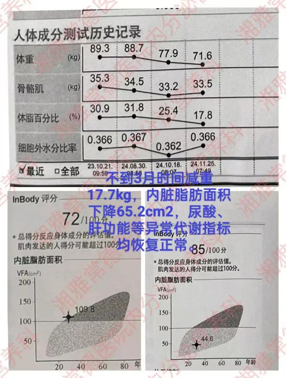 图中男子,经科学减脂约3月,体重减掉17.7kg,内脏脂肪面积下降65.2cm2,肌肉保持良好,尿酸,肝功能等异常代谢指标均恢复正常。