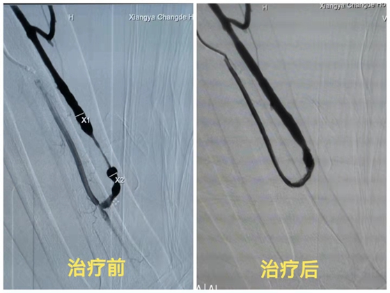 53岁的透析患者李女士,半年前在当地医院行“动静脉内瘘成形术”,在当地做维持性血液透析,但近半月来动静脉内瘘流量不佳,慕名来到湘雅常德医院就诊,收入肾内科。入院后完善相关检查,发现左前臂距离内瘘吻合口3cm处,在头静脉存在长度约3cm的局限性狭窄,狭窄段血管直径约1.5mm,前后非狭窄段直径约4mm。明确病因后,肾内科成小苗副教授、李大伟主任医师及党智杰副主任医师,联合我院放射介入科汤金城副主任和黄彬副主任医师,共同制定治疗方案,为患者成功实施了PTA治疗,解决了内瘘狭窄的难题,患者能顺利进行血液透析,感到非常满意。