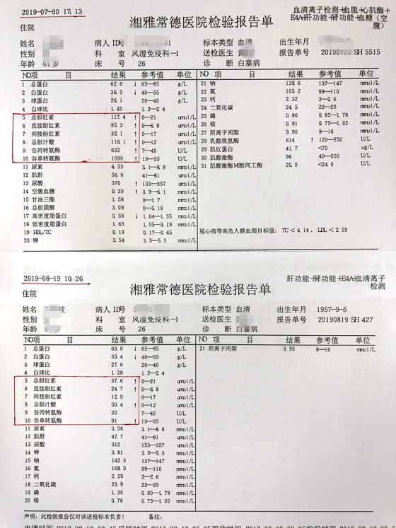 家住鼎城区的王阿姨今年61岁,今年年初,因为口腔溃疡反复发作、连日大于40℃的高烧以及皮肤长“红坨”去当地医院就诊,经诊断为“白塞病”。对于这种疾病,王阿姨一家人都十分陌生,为此王阿姨的家人带她辗转多家大型医院,四处求医。 3个月前,家人为其寻得民间一中医,并开了几十付中药治疗。但是渐渐的王阿姨出现了厌油、食纳减退、全身乏力、全身皮肤变黄、小便黄等,王阿姨以为中药效果不好,白塞病疾病活动。