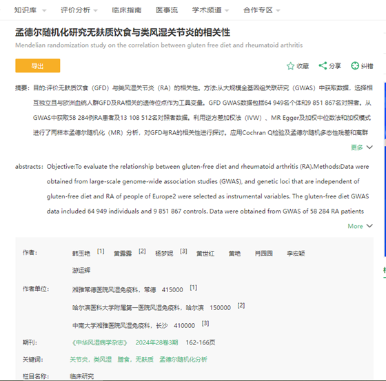 近日,湘雅常德医院风湿免疫科团队在中华系列期刊《中华风湿病学杂志》(CSCD收录、中国科技核心、北大核心)上发表一篇临床研究论文,论文题目为《孟德尔随机化研究无麸质饮食与类风湿关节炎的相关性》。湘雅常德医院风湿免疫科韩玉艳副主任医师为第一作者,湘雅常德医院风湿免疫科为署名单位。