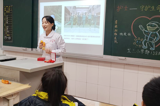 近日,湘雅常德医院神经内科护士长施霞丽、护士陶培培受邀赴常德市芷兰实验学校开展健康讲座,旨在让一年级的小学生了解平凡却又神圣的护士职业,同时引导孩子们树立正确的人生观、价值观,呼吁敬佑生命、守卫生命,应从小做起。