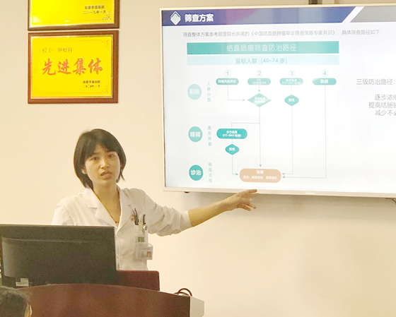 肿瘤科秘书、胃肠肿瘤学组责任医生郑乐以《癌症筛查,让生活更美好!》为题作主题演讲,详细介绍肠癌流行病学现状、我国开展肠癌早筛工作的发展历程和概况以及目前进行早筛工作的方法和工作流程,并展示了开展系统性早筛对于降低肠癌发病和死亡风险的巨大作用。