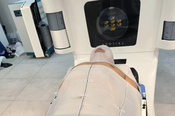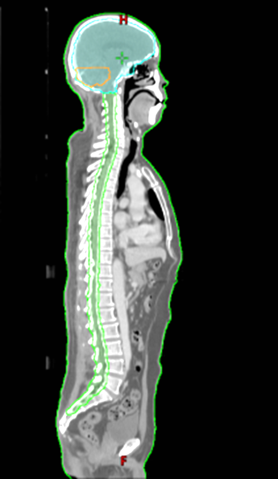 接诊后,肿瘤科钟美佐主任同秦勤主治医师联合神经外科、放射影像科、病理科根据病理诊断结果及患者实际情况反复讨论后决定实施全脑全脊髓放射治疗。考虑到照射范围长而复杂,肿瘤科放射治疗中心物理师医技团队使用一体板对患者进行全身固定,对全身采用多角度分段照射,在肿瘤接受足够照射的同时,保护脑干、晶体、视神经等重要正常器官。在治疗期间,医生、物理师、技术员会实时采集患者治疗时的体位影像,确保照射的安全准确。