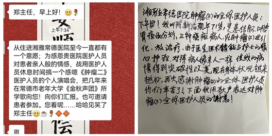 近日,湘雅常德医院肿瘤二区副主任郑乐收到这样一条微信:从住进湘雅常德医院至今一直都有一个心愿,为感恩贵院医护人员对患者亲人般的照护,申请占用医护人员休息时间搞一个感恩《肿瘤二》医护人员的个人演唱会,把几年来在常德市老年大学《金秋声团》所学的歌向您、向医护人员汇报。这条信息字字暖心、句句真挚。