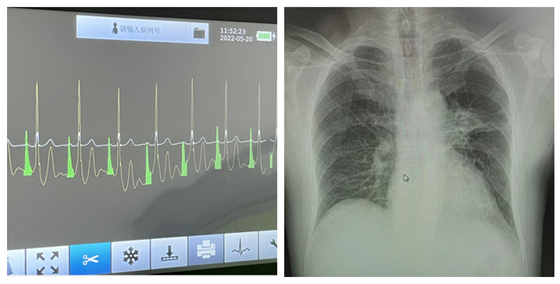 我院在此次B超引导结合心腔内电图定位技术的实施过程中,使用了先进的3CG技术,操作时通过心电图P波的波形和颜色变化,实时判断PICC导管的尖端位置,为安全置管和确定导管最佳位置提供保证。本案例患者,通过术后胸片定位确定导管尖端位于第八椎体上缘右侧水平,符合INS指南中推荐的最佳位置。