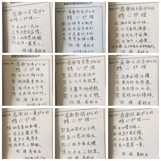 从湘雅常德医院开院以来,姜奶奶就因为肠胃问题挂号中西医结合康复科,蒋荣鑫主任亲自进行中医诊断后,为其开取中药。患者回家服用后疗效甚好,之后每隔半年就会请蒋主任调理一次。2020年因疫情耽误,姜奶奶一直未来院就诊,今年年中姜奶奶再次走进蒋主任诊室,听完其个人描述,了解到其大便性质改变,且有家族直肠癌病史,蒋主任建议住院进一步检查,完善相关治疗。 姜奶奶住院期间由老伴胡爷爷照料,姜奶奶住院的第二天早晨,胡爷爷说自己有些失眠,感到头晕不适。值班护士立即为老人测量血压,发现血压明显偏高,马上请值班医生为其诊治,医生建议老人住院进一步了解病因。住院后主治医生胡昌凯还发现胡爷爷有糖尿病,经过治疗为胡爷爷制定缜密的治疗方案,值得庆幸是胡爷爷检查没有其他并发症,很快胡爷爷血压血糖也慢慢得到控制。姜奶奶通过中药调理不便秘了,排便也正常了。在调养中姜奶奶还诉说自己经常流鼻血,最近流鼻血更频繁。管床医生胡昌凯立即联系耳鼻喉科医生为其进行检查,发现老人鼻粘膜易出血并马上进行了治疗。 护理人员还细心的和其他患者做工作,将老两口调至一个病房,胡爷爷和姜奶奶感激不尽,老人们感慨的赞美,医护人员的精心护理让他们感受到温暖,医护人员关爱病人、护理病人的精神也让他们格外感动。藏头诗内容:万花丛中一点红,芷紫花香呈真情;溶入血液感肺腑,好似亲人赛亲人。(万芷溶好)龙行太空呈吉祥,维民祈福保平安;念及苍生福禄寿,帮击妖孽民健康。(龙维念棒)张开双臂护病人,敏捷身手医术精;优中凸显尖尖角,秀惠仁慈集一身。(张敏优秀)郭葛(洪)医术天下传,娟春仁慈同根生;热心服务病友暖,情同手足心连心。(郭娟热情)杨柳青青报春晖,小荷尖尖露志奇;曼曼岁月展身手,强强技艺人敬佩。(杨小曼强)王道建国稳边疆,佐君治邦民安康;臣能民悍江山永,贤惠精细好榜样。(王佐臣贤)皇家谋求国运兴,甫天之下丰收景;蓉美慧秀娇娇颜,能干你能冲技术精。(皇甫蓉能干)杜撰成真国兴旺,文兴武备抗强梁;莉(利)国利民中国强,优秀能干人夸奖。(杜文莉能干)张扬旗举开新宇,闻所未闻奇迹到;优中更显优中优,秀惠贤能棒又棒。(张闻优秀)阳阴五行辨证论,萍(平)衡调整寒热证; 真经传承五千年,棒击击病根民欢欣。(阳萍真棒)