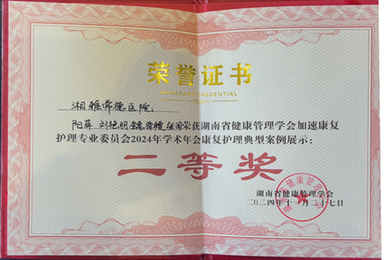 11月27日,在湖南省健康管理学会加速康复护理专业委员会举办的年度学术盛会上,湘雅常德医院中西医结合、康复科护理团队以其卓越的表现和创新的护理理念赢得了广泛的赞誉与认可。该团队荣获康复护理典型案例展示二等奖,这一成就不仅彰显了湘雅常德医院护理团队在专业领域的深厚功底,也体现了医院在提升护理服务质量上的持续追求和显著成效。