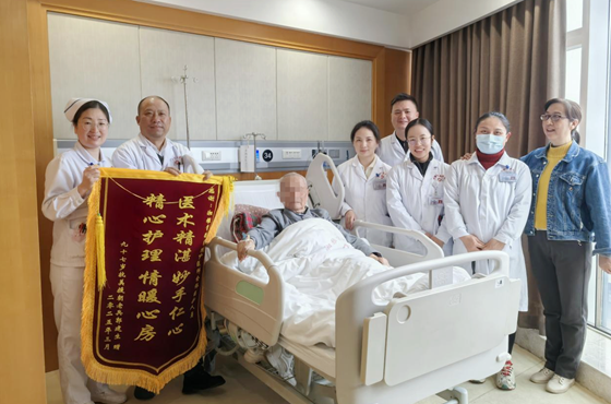 患者病情现已稳定,查房时,郭爷爷激动地握住医护人员的手说:“我感觉又活过来了,谢谢你们又救了我一命!”。他用颤抖的双手在纸上写下“医术精湛、妙手仁心、精心护理、情暖心房”的感谢词,并让家属制成锦旗赠予医护团队。
