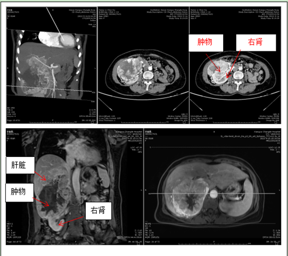 李阿姨入住普外科后,科室迅速对李阿姨进行相关检查,CT和磁共振均确定可能是巨块型肝癌。李阿姨没有乙肝背景,不喝酒,无脂肪肝,无肝硬化,肝癌缺乏诱因,且李阿姨的肿瘤标志物均正常,无疑使诊断变得扑朔迷离。仔细阅片可知肿物上顶肝脏、下压右肾,与肝肾关系均密不可分,李阿姨高血压多年,服用硝苯地平片降压,但血压控制欠佳,一度怀疑肿瘤是否来源肾脏或者肾上腺,因此进一步进行了相关检验予以排查。