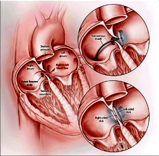卵圆孔未闭是一种先天性心脏结构异常。卵圆孔是心脏房间隔胚胎时期的一个生理性通道,正常情况下婴儿出生后2个月左右融合,若超过1岁未能融合则形成卵圆孔未闭。当各种原因(如剧烈运动、咳嗽、潜水等)导致患者右心房压力超过左心房压力时,卵圆孔未闭可致心脏内血流出现明显的右向左异常分流。从而引起不明原因的脑卒中、偏头痛、减压病、斜卧呼吸-直立性低氧血症等相关临床综合征,开始出现相应症状,包括不明原因的的头痛、头晕、呼吸困难或肢体无力。