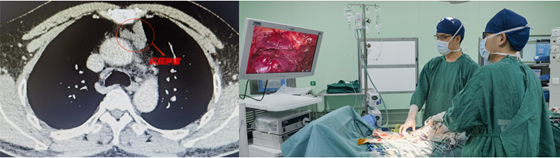 今年54岁的陈先生在6年前于当地医院检查发现前纵隔肿瘤,陈先生迫切想手术治疗,但被告知肿瘤离心脏大血管很近,手术难度大、风险高,陈先生便打消了手术治疗的想法,并定期随诊。今年,陈先生因工作原因,来到湘雅常德医院随诊。心胸外科何志伟主治医师接诊后,为其复查胸部CT,检查结果提示患者前纵隔肿物有增大,考虑胸腺瘤可能,遂建议陈先生住院行手术治疗。