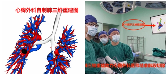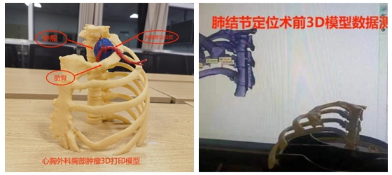 除了肺部三维重建技术,心胸外科更是自己开展了心胸疾病的3D打印技术。通过对病变及周围组织的CT数据进行3D打印,打印出来的模型能够更直观地感受病变的范围与周围组织的关系、病变与血管的距离,同时医生可以通过模型,根据比例测量各项手术所需的数据。根据这些数据,心胸外科还研发了在术中无创对肺结节进行定位的方法。医生通过模型测量出肺结节与各骨性结构的距离,从而精准定位肺结节位置,便于手术医生对肺结节进行精准切除。
