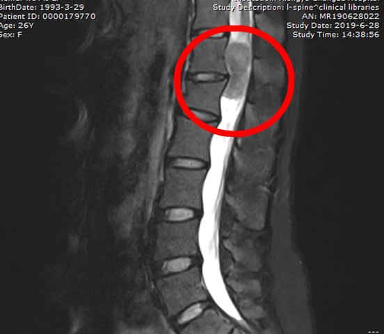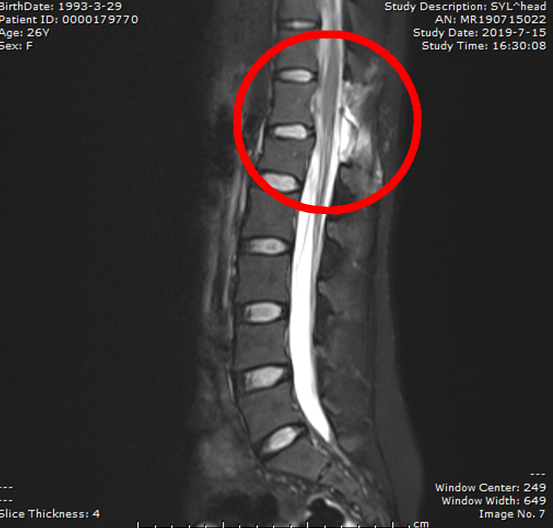 26岁的伍女士一直都有腰背部疼痛的毛病,但就在3个月前,她突然感到腰背部的疼痛逐渐加重,同时右下肢也开始疼痛、麻木,甚至出现持续性胀痛,尤其在夜间休息时、久坐、久站后疼痛格外明显,难以忍受。后到当地医院进行理疗,但症状仍无缓解,后转入湘雅常德医院骨科就诊,而检查结果却令她大吃一惊!