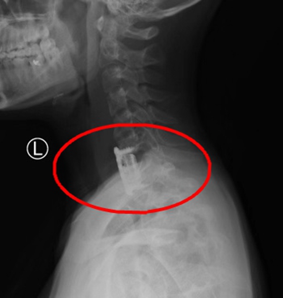 经过骨科主任张朝跃教授、张丕胜主任医师领军的脊柱外科团就患者病情多次讨论,考虑到该年轻患者的第七颈椎骨质破坏结核侵蚀可能性大,常规椎体次全切钛笼置入术后沉降率高等并发症多,建议病灶清除的同时联合最新人工椎体材料实施第七颈椎椎体置换手术。