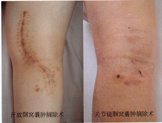 术后第2天,小刘同学就可以下地活动了。术后第5天出院时,可以活蹦乱跳了。刘妈妈和刘爸爸更是握着史医生的手术说:“非常感谢湘雅常德医院骨科团队精湛的技术,手术非常的成功,早知道这样,应该早点带儿子来湘雅常德医院接受微创手术。”科普小知识: 一:膝盖后面长的“坨” 是什么? 膝关节后面长的肿物,医学上统称为“腘窝囊肿”,是膝关节最为常见的疾病之一。 二:是怎么产生的? 腘窝囊肿的病因多不在囊肿处,膝关节本身疾病为腘窝囊肿产生的根源。腘窝囊肿的产生与膝关节退变有明显关系。在腘窝囊肿患者中有近乎一半患者均合并有半月板损伤。 三:怎么确诊?需要做什么检查吗? 腘窝囊肿的诊断比较简单:典型的病人多数是无意中发现腘窝部较小的肿物。虽然通过体格检查很容易发现腘窝囊肿,但是完善B超和膝关节核磁也是非常必要的。一方面:帮助我们在在术前确定腘窝囊肿是否与关节腔相通?另一方面:帮助我们明确关节内合并病变,同时有助与腘窝囊肿相鉴别的疾病,谨防误诊、漏诊的存在。 四:腘窝囊肿的临床表现都有哪些呢? 大部分的腘窝囊肿患者来医院就诊,都有不同程度的影响生活、工作等。起病开始阶段,患者多是无意中发现腘窝部较小的肿物,随着时间的推移,病情的加重,患者出现腘窝部紧胀感,后逐渐出现在运动或日常活动后疼痛,剧烈紧胀感,最后形成静息时也能感受疼痛,腘窝部绷紧、满胀感。这都是因为随着囊肿大小的增长,压迫到其周围的血管、神经,引发了一系列的临床症状。 五:怎么治疗?需要手术吗? 1.对于仅仅是无意中发现的囊肿,还没有产生明显“腘窝部紧胀感,满胀感”、“在运动或日常活动后出现疼痛,剧烈紧胀感”“小腿酸胀”等周围的血管、神经受压的症状的患者,可以选择保守治疗。例如:单纯对囊肿进行穿刺,或者不予理会。 2.但是,当腘窝囊肿症状严重或合并病变及损伤持续加重时或非手术治疗无效时,则需要手术治疗。 六:都有哪些手术方式?需要开刀吗? 1.传统的也是最经典:需要做一个切开手术切口长约10cm左右。 2.微创手术的办法:关节镜下清理关节内病变,同时切除腘窝囊肿,标本兼治。因为腘窝囊肿大部是由关节内病变引起。如果只切除囊肿,不处理关节内病变,手术后一是复发率高,二是关节内病变持续存在。而关节镜手术切除腘窝囊肿,仅仅需要4 处0.5cm 的切口,切口总和长度约2.0cm ,不仅创伤小、复发率更低,而且可以同时治疗关节内病变,达到标本兼治目的。 七:需要住多久?什么时候可以下地? 1.首先患者入院后需要完善术前检查,除外手术禁忌征,一般会在住院后第三个工作日安排手术。 2.大多数患者术后第二天就可以下地行适量走了(骨关节炎特别严重的病人除外)。 3.大多数患者术后3--5天没有明显不适后,就可以出院。所以平均住院日是7-8天。