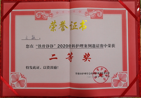 本次会议就骨科发展前沿、专科护士培养、专病护理、快速康复、护理质控、护理科研等进行专题讲座,并举办“铁骨铮铮”——2020骨科护理案例邀请赛。经过激烈的角逐,由我院骨科二区金惠护士长率领的护理团队在比赛中脱颖而出,文颖护师以《涅槃后的重生——一例上颈椎损伤患者非手术治疗历程》为题参赛并荣获二等奖,案例以临床治疗过程中存在的护理问题及护理难点为导向,通过科学化、人性化、个性化的护理措施切实解决患者痛苦,促进患者恢复健康,重获新生,得到了湖南省医学会骨科学专业委员会护理学组长、中南大学湘雅医院护理部副主任周阳教授的高度肯定。