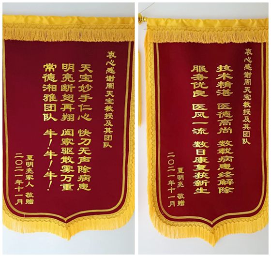 通过医护团队的精湛技术及精心照护,夏叔叔恢复得非常顺利,折磨他10多年的疼痛终于消失,他又可以自由行走了。出院时,夏叔叔特意送来一面锦旗以表感谢。