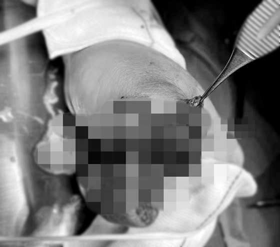陈治佑医生赶到后,详细为李阿姨体查可见右手拇指呈不全离断,仅有掌侧几毫米宽度的皮肤相连,离断的拇指末梢指腹苍白干瘪,感觉丧失,无毛细血管回流,断端搏动性射血,当即用无菌纱布给阿姨加压包扎止血。