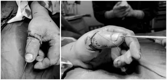患者入院后完善相关检查,诊断为拇指不全离断伤,具有手术指征,无手术禁忌,骨科二区王穗源主任医师及陈治佑医师团队紧急在神经阻滞麻醉下为患者行右手拇指手外伤清创探查:右手拇指指骨骨折克氏针固定、拇指指深屈肌腱、伸指肌腱吻合、指固有动脉吻合、指背静脉吻合、桡侧指固有神经吻合术。通过医护团队的精湛技术及悉心照护,李阿姨术后恢复良好,手指成功存活。