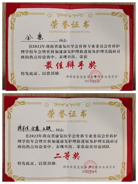 8月25到27日,湖南省康复医学会骨科专业委员会骨科护理学组年会暨“骨科加速康复护理新进展及护理实践研讨班”在长沙举办。本次会议以“谋护理之深耕,聚力量而前行”为主题,旨在进一步普及和深化ERAS,了解ERAS在骨科的新进展和临床实践现状,并就热点学术问题举办辩论赛。我院护士长金惠老师带队,骨科陈宇佳护师、文颖护师组成的团队参加此次辩论赛。