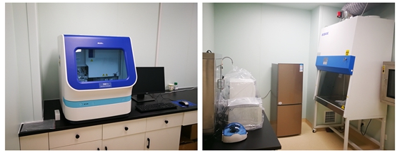 基于全院规划、整合分子诊断业务归口分子中心需要,分子中心已配备目前最为先进的相关仪器设备:一台ABI3500Dx测序仪、一台ABIQS5(6通道,7500升级版)荧光实时定量PCR仪、一台天隆TL988(4通道)荧光实时定量PCR仪、一台Genesy 96E基因扩增热循环仪,两台杂交仪、两台生物安全柜、三台荧光显微镜等高端仪器设备。技术涵盖普通扩增PCR、实时荧光定量PCR、ARMS-PCR、FISH、一代测序等平台,后期将搭建高通量测序(NGS)、质谱分析等平台。分子中心所开展项目,均基于最新研究成果与先进且成熟的相关基因检测技术相结合,应用于涵盖多种慢病、肿瘤、感染性疾病及遗传病等临床精准分子诊断,以指导个体化、靶向用药等精准治疗。