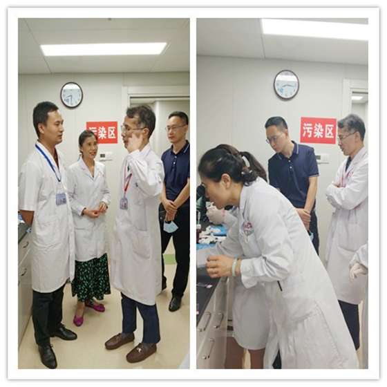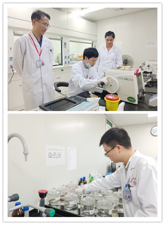 在比赛紧张进行的过程中,医院医务部黄炯主任、质控部李亮主任亲临比赛现场,和彭劲武主任、傅春燕老师、杨玉兰老师等组委会专家亲切交谈,详细询问比赛的筹备过程、评分规则等细节,并现场观摩,亲身体验病理制片的操作流程。两位主任的到来也给参赛选手们带来了鼓励,增强了信心。