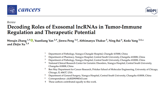 2023年伊始,湘雅常德医院病理科在D类国际顶级期刊《Cancers》 (JCR Q1,IF=6.575)在线发表了题为“Decoding Roles of Exosomal lncRNAs in Tumor-Immune Regulation and Therapeutic Potential ”的综述性科研论文。病理科张文琴技师为该文的第一作者(排名第一),湘雅常德医院为论文第一作者单位,中南大学湘雅医院为论文通讯作者单位,病理科彭劲武、徐志杰教授等为该文的重要共同作者。