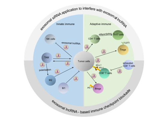 在肿瘤微环境(TME)中,肿瘤细胞和非肿瘤细胞之间的双向交流在肿瘤发生发展中发挥关键作用。越来越多的研究表明,在免疫细胞与肿瘤细胞的生物信号交换和相互作用过程中,外泌体lncRNA被认为是重要的介质之一,可以干扰固有和适应性免疫反应,从而影响肿瘤的进展和治疗疗效。