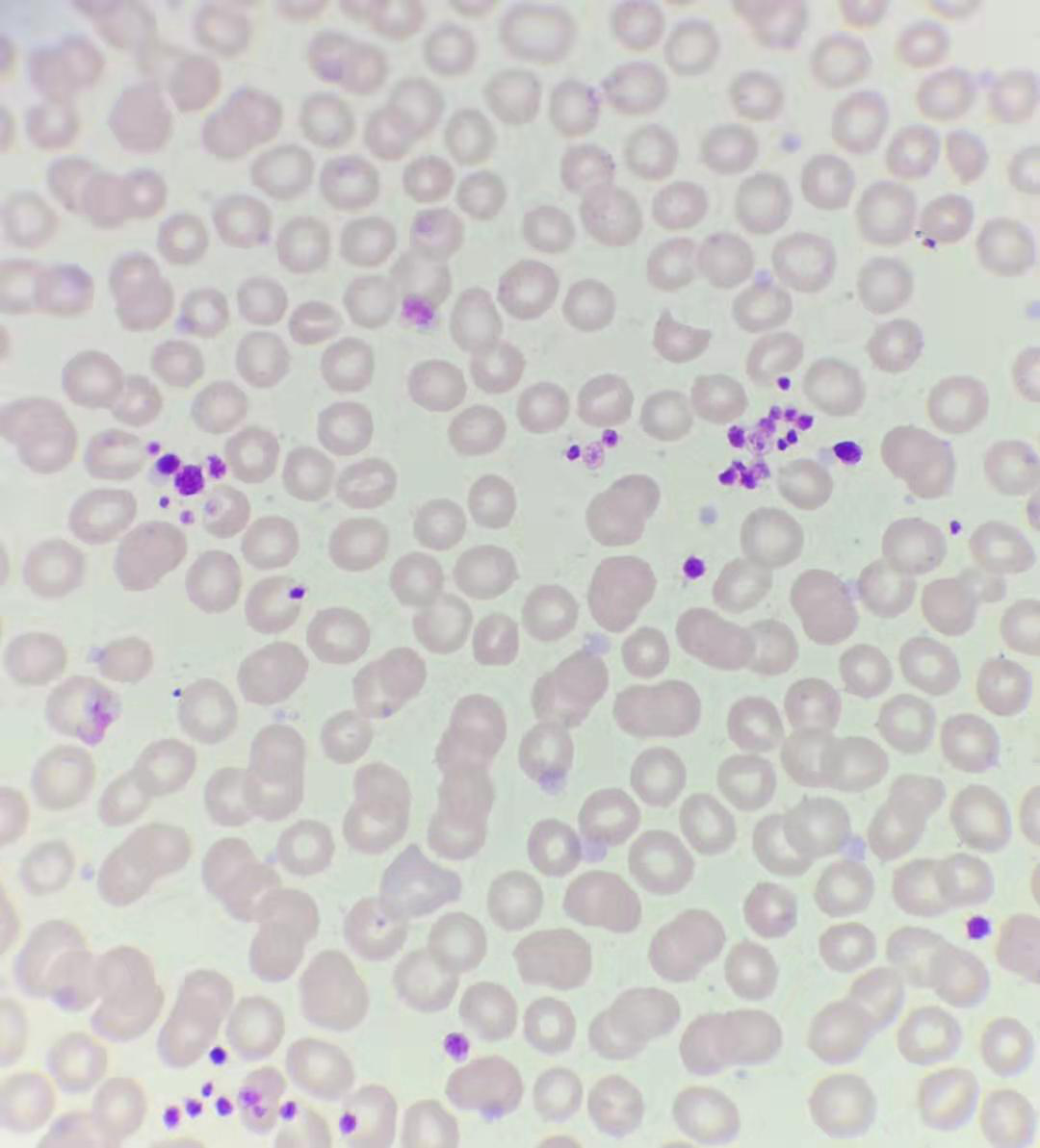 8月26日上午,检验科临检室为一门诊患者行血常规检测时,发现该患者血小板只有16×10的9次方/L,已经达到危急值,于是对其推片显微镜下复检时,镜下可见血小板聚集,考虑患者有可能为EDTA依赖性假性血小板减少,于是重新更换为肝素、枸橼酸钠抗凝管都没有被纠正,镜下均发现血小板聚集,最后当场采用无抗凝剂管当场抽血上机及结合血涂片血小板结果,该患者血小板纠正为177×10的9次方/L,属于正常范围。