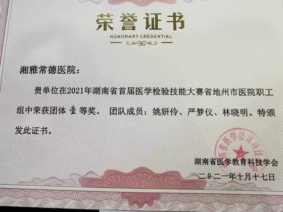 10月15日至17日,湖南省首届医学检验技能大赛暨学术交流会在长沙召开。来自湘雅常德医院检验科姚妍伶、严梦仪、林晓明三名检验人员组成的参赛队伍在此次比赛全省75支队伍中脱颖而出,斩获团体一等奖优异成绩。